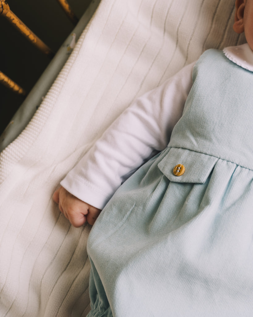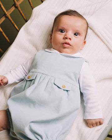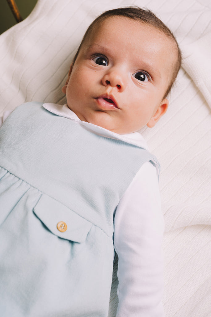 Fofo em veludo cotelé azul inglês . Tem abertura nas costas com fecho invisível e entre pernas com botões para permitir vestir e mudar o bebé com facilidade. É forrado em algodão orgânico. Perfeito para usar neste Outono com os nossos bodies ou blusinhas de gola e aconchegar com os casacos em tricot.