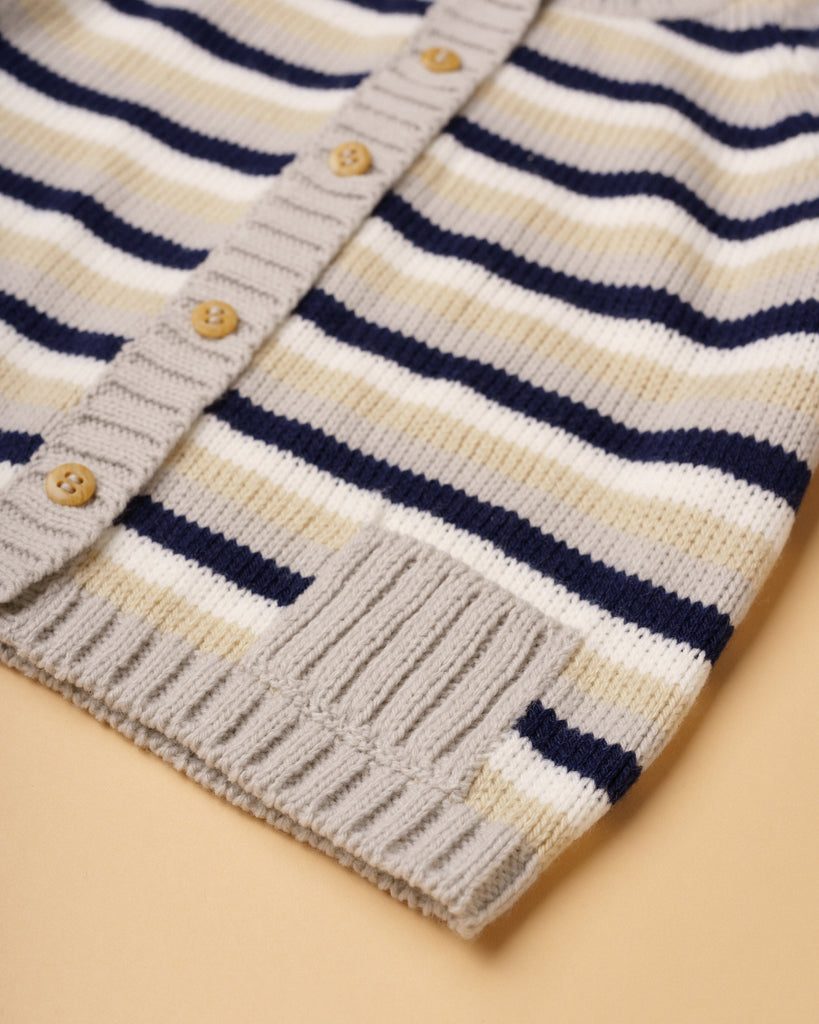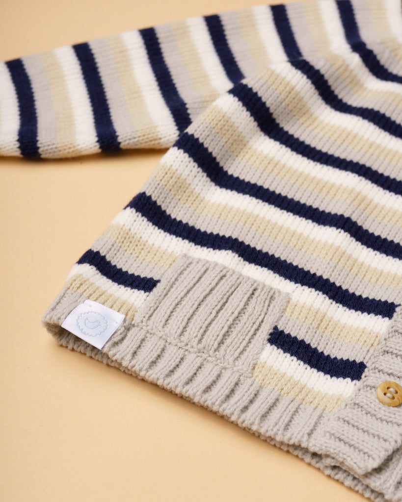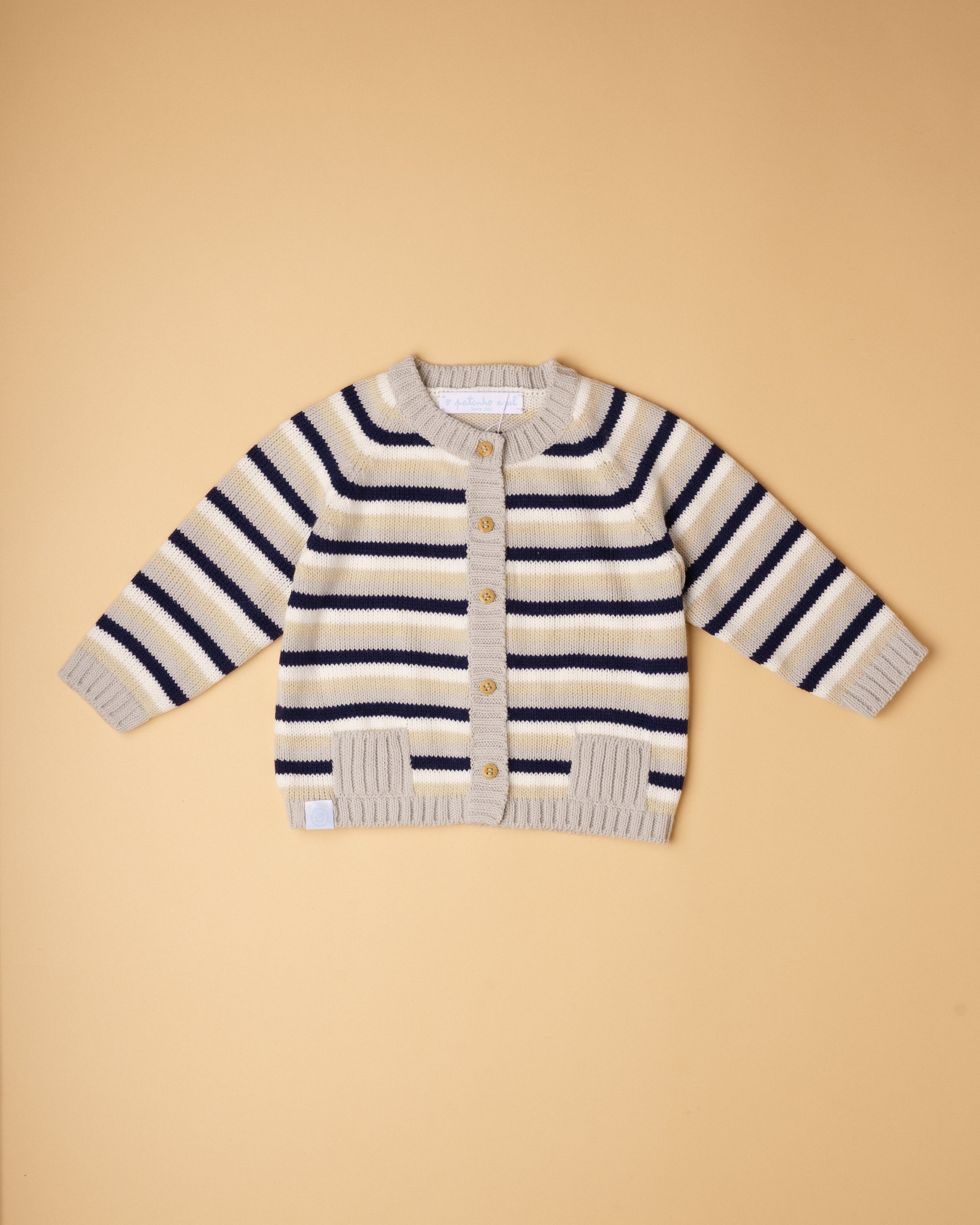 Casaco de tricot manual em fio suave, confortável e antialérgico com risquinhas nas cores aloé vera, bege, cru e cinza claro. Tem decote redondo, bolsinhos e aperta na frente com botões de madeira. Muito prático e útil para usar nos dias mais frescos. Combina com qualquer uma das peças da nossa coleção.