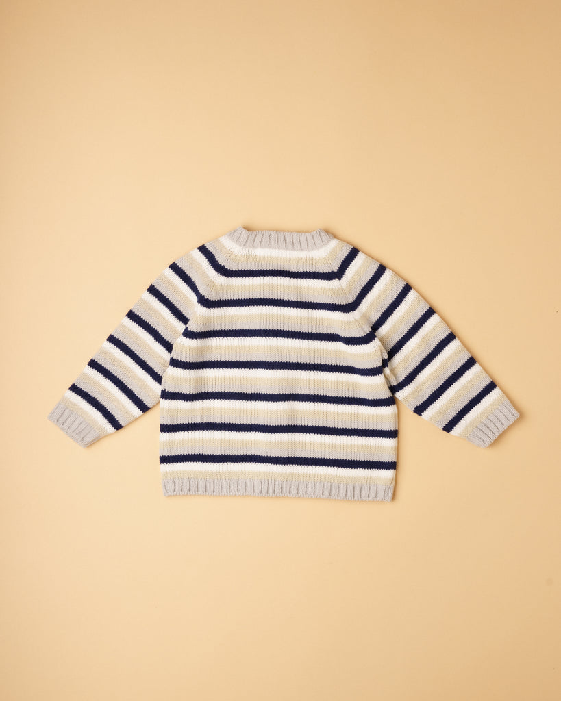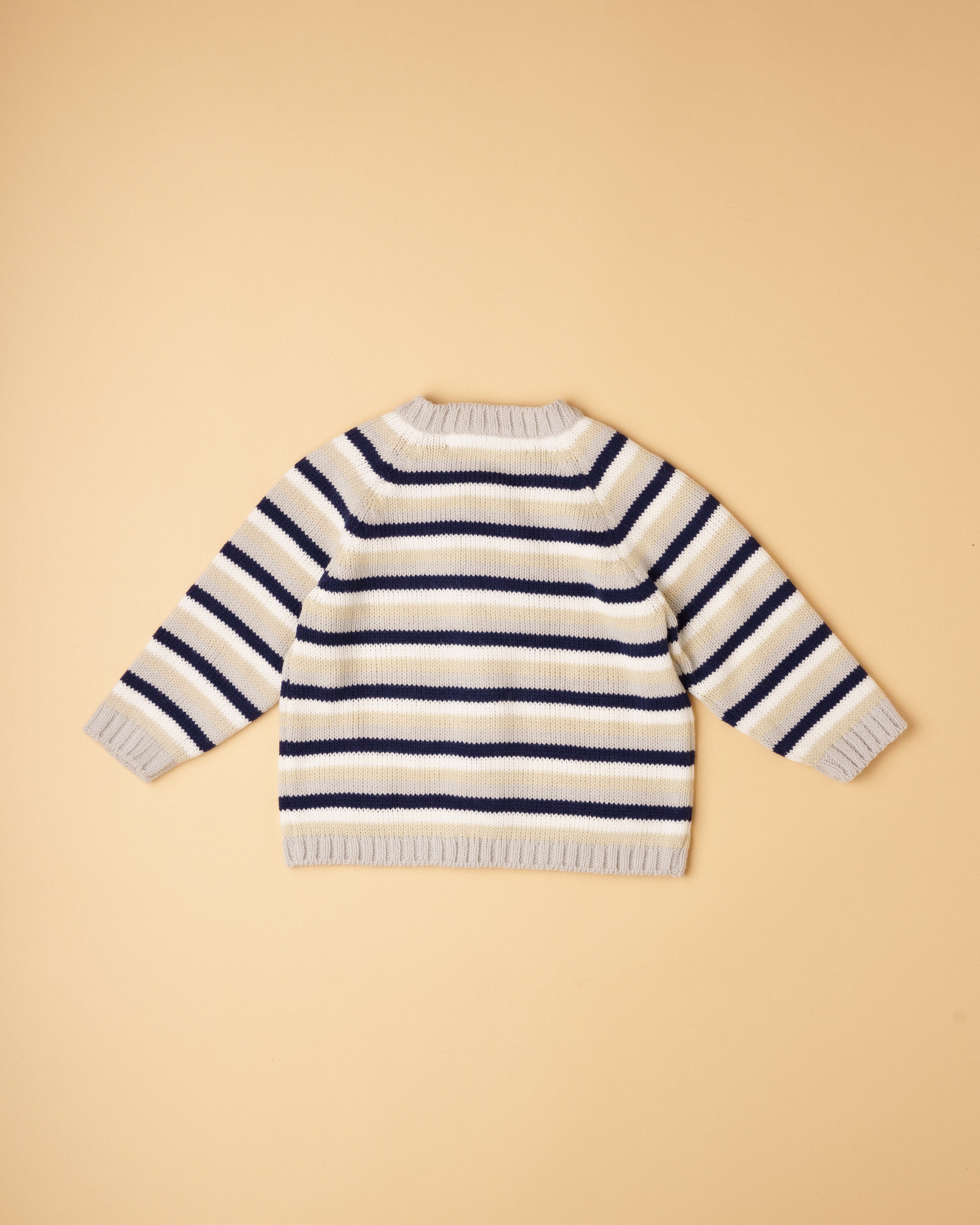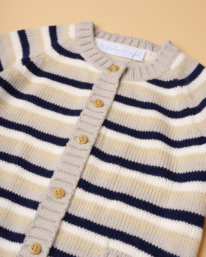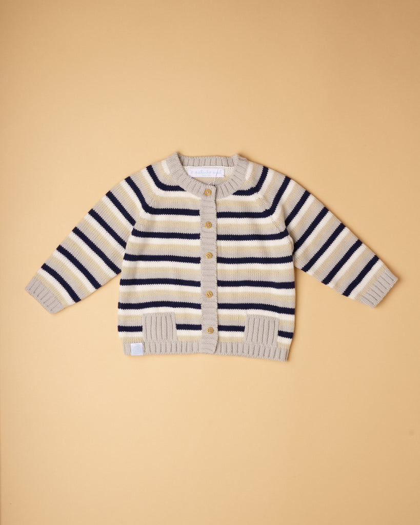 Casaco de tricot manual em fio suave, confortável e antialérgico com risquinhas nas cores aloé vera, bege, cru e cinza claro. Tem decote redondo, bolsinhos e aperta na frente com botões de madeira. Muito prático e útil para usar nos dias mais frescos. Combina com qualquer uma das peças da nossa coleção.