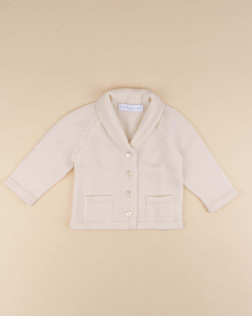 Casaco de tricot manual em lã merino suave, confortável e antialérgico. Tem gola com decote de bico, bolsinhos e aperta na frente com botões madrepérola. Muito prático e útil em qualquer estação.