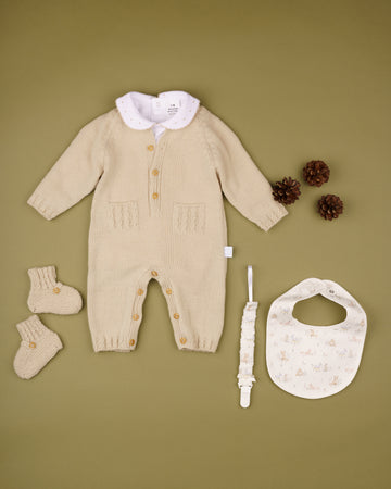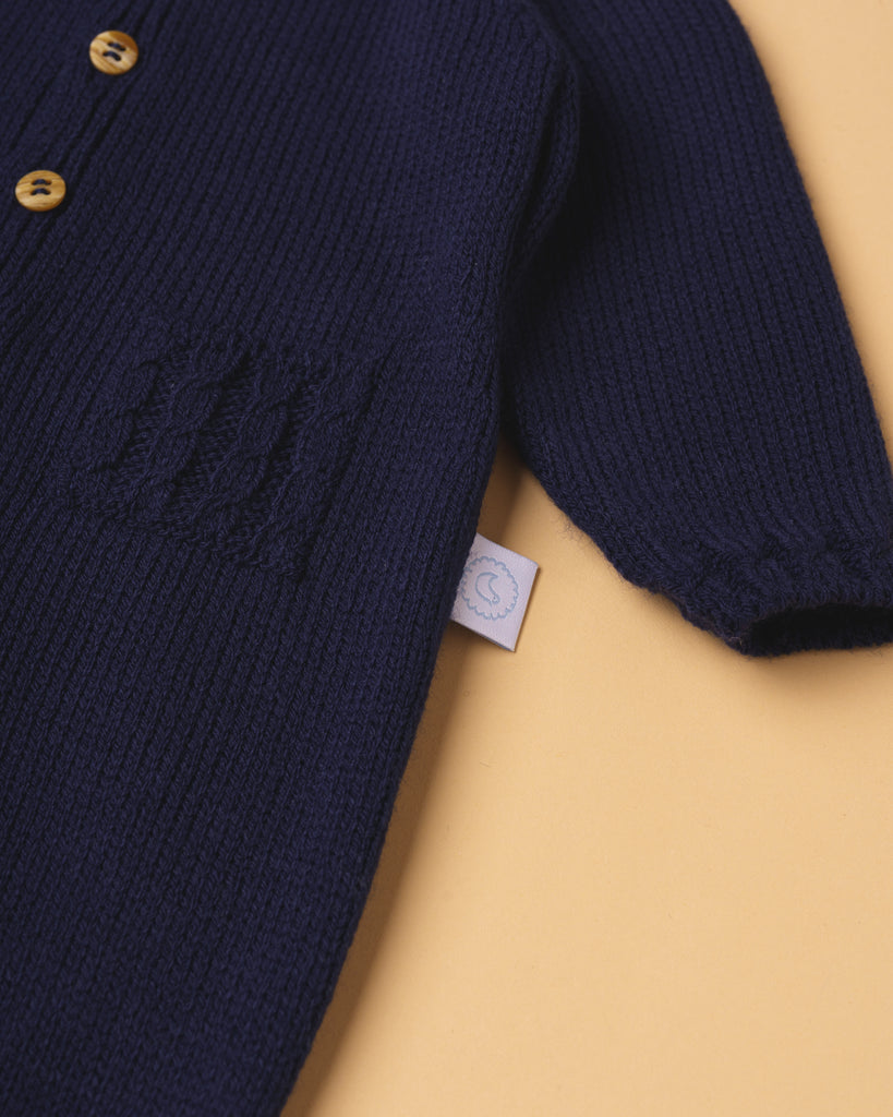 Aperta na frente e entre pernas com botões de madeira para permitir vestir e mudar o bebé com facilidade. Pode combinar com o gorrinho/ touquinha e botinhas do mesmo tema e assim fazer um look muito doce e especial.