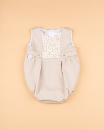Fofo em piqué bege com o corpinho de bordado manual. Aperta nas costas com fecho invisível e entre pernas com botões de madrepérola para permitir vestir e mudar o bebé com facilidade. É forrado em algodão orgânico. Perfeito para usar com as nossas blusinhas de gola e manga comprida nos dias especiais. O prazo de entrega desta referência pode ir até 10 dias.
