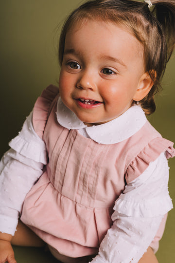 Fofo em veludo cotelé/ rosa velho. Tem abertura nas costas com fecho invisível e entre pernas com botões para permitir vestir e mudar o bebé com facilidade. É forrado em algodão orgânico. Perfeito para usar neste Outono com os nossos bodies ou blusinhas de gola e aconchegar com os casacos em tricot.