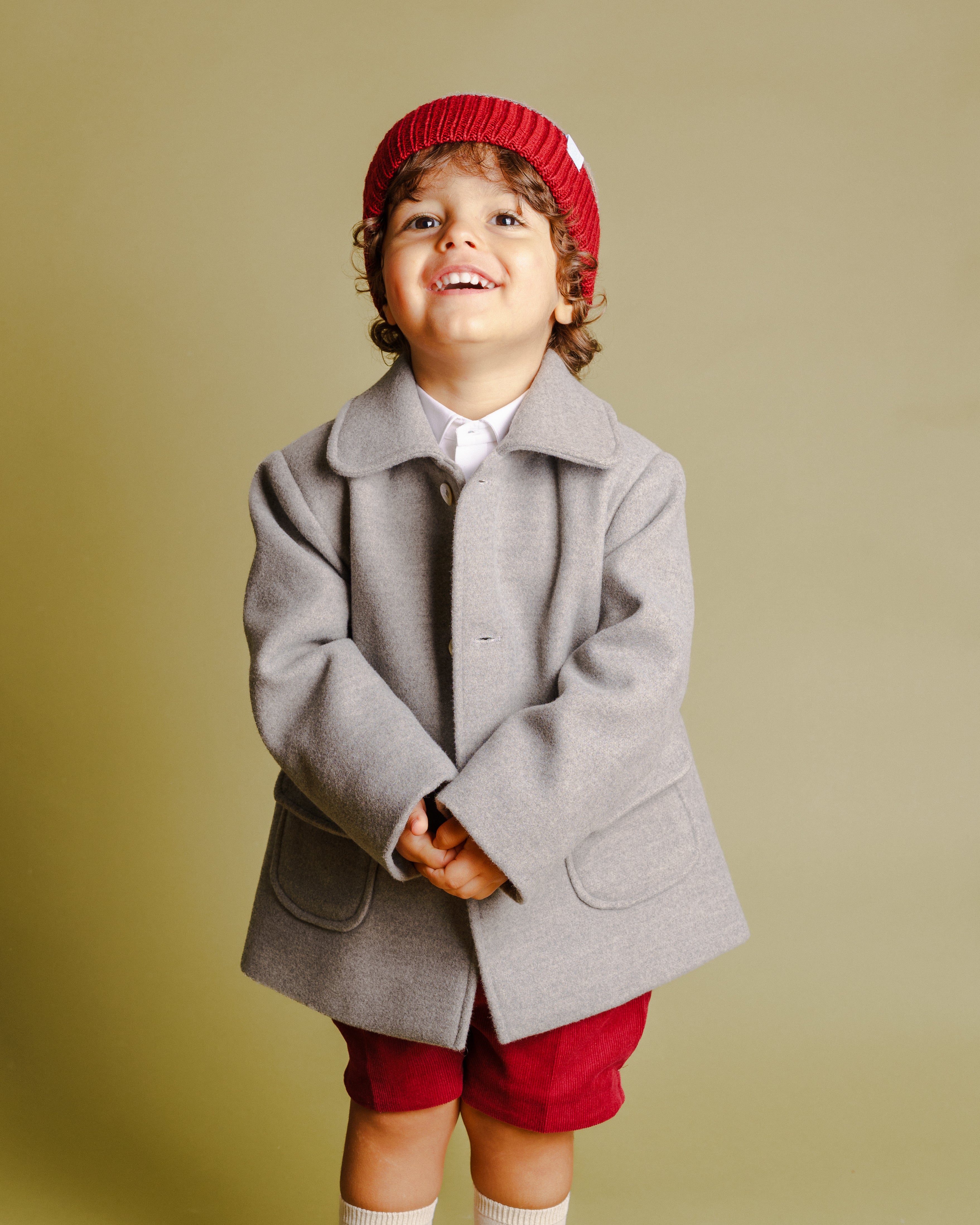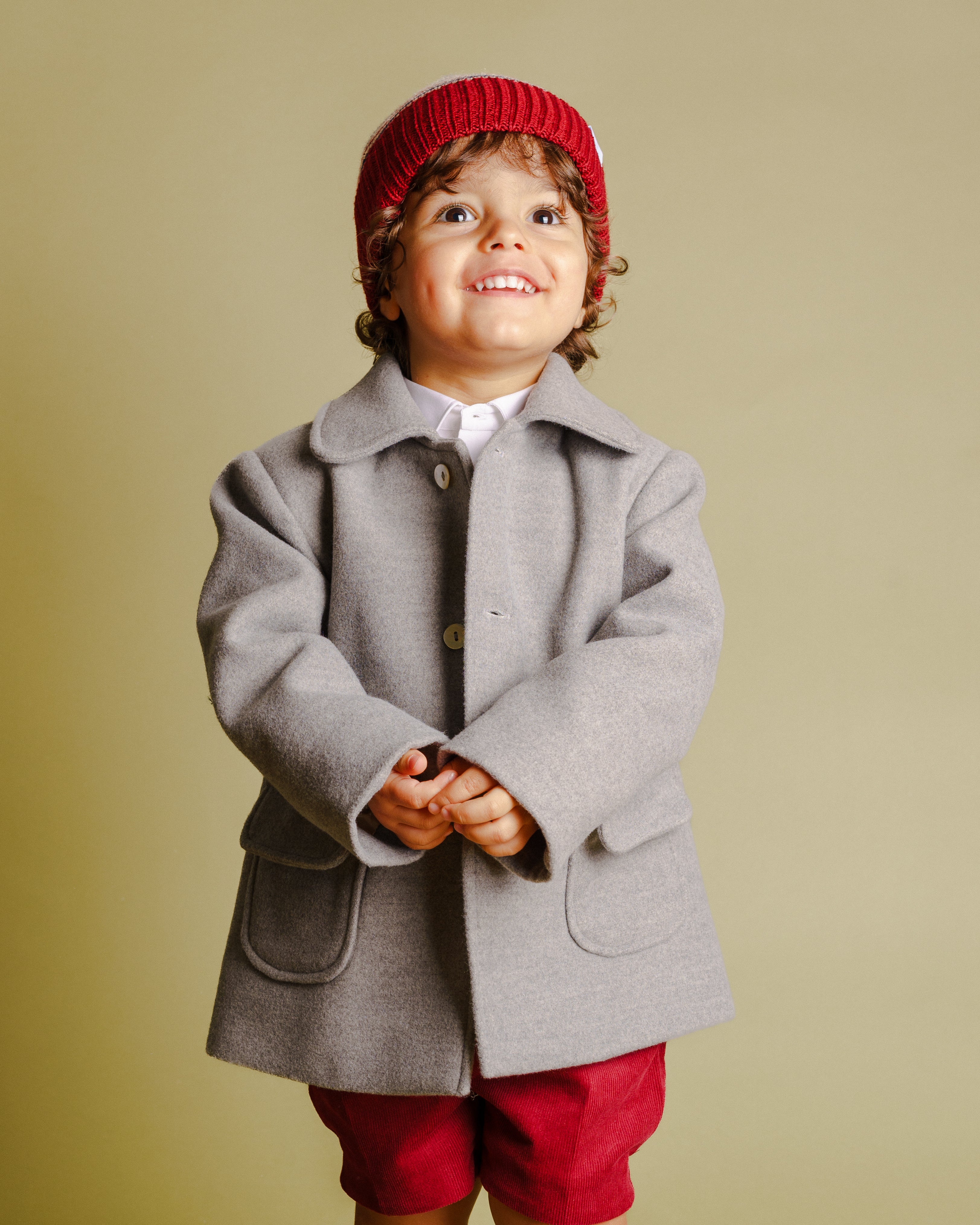 Casaco em fazenda de lã na cor cinza claro. É forrado, tem bolsos na frente e aperta com botões de madrepérola. Muito aconchegante e versátil nos dias frios