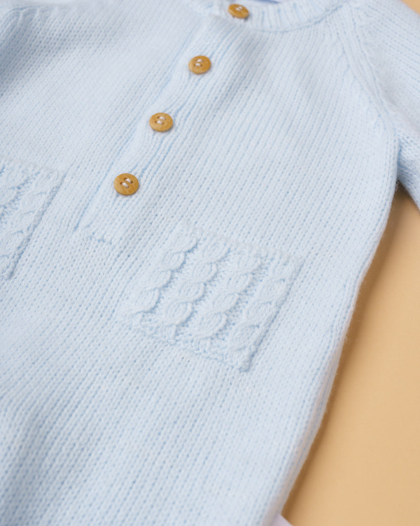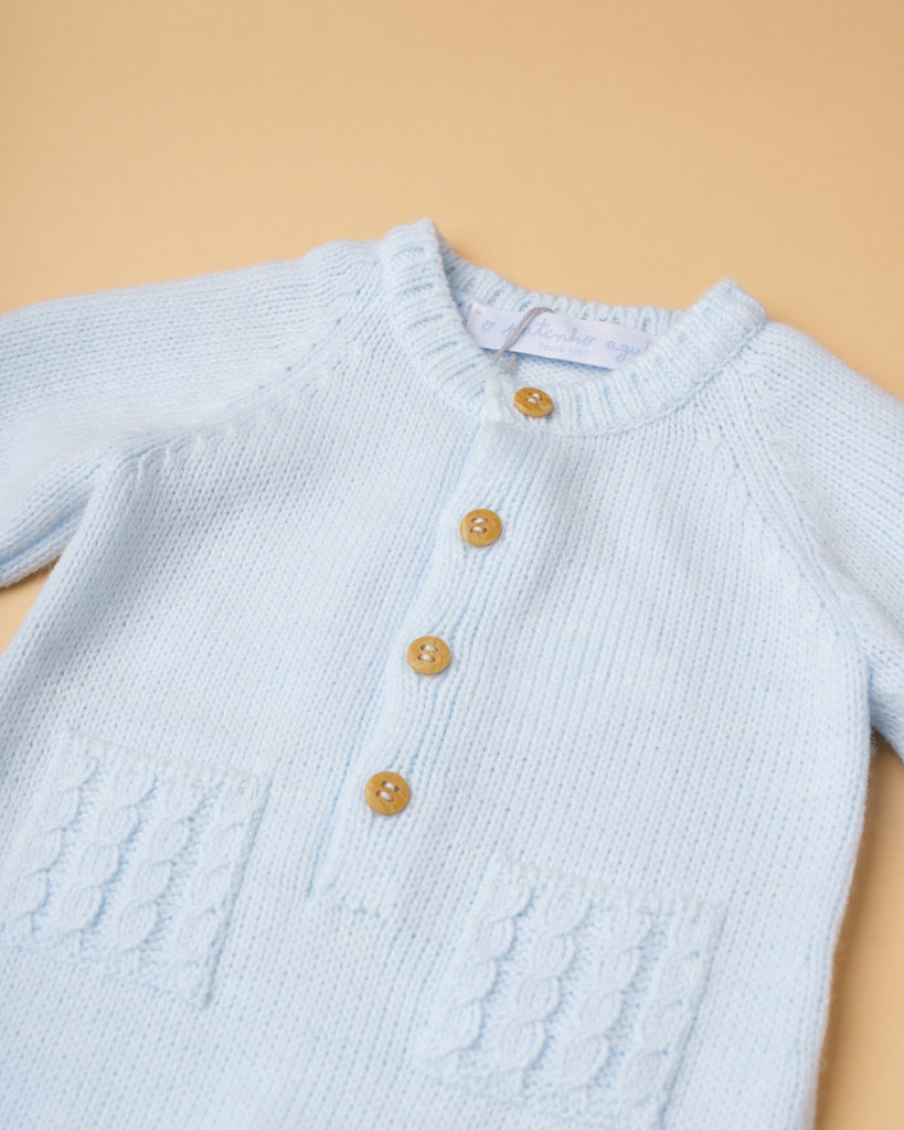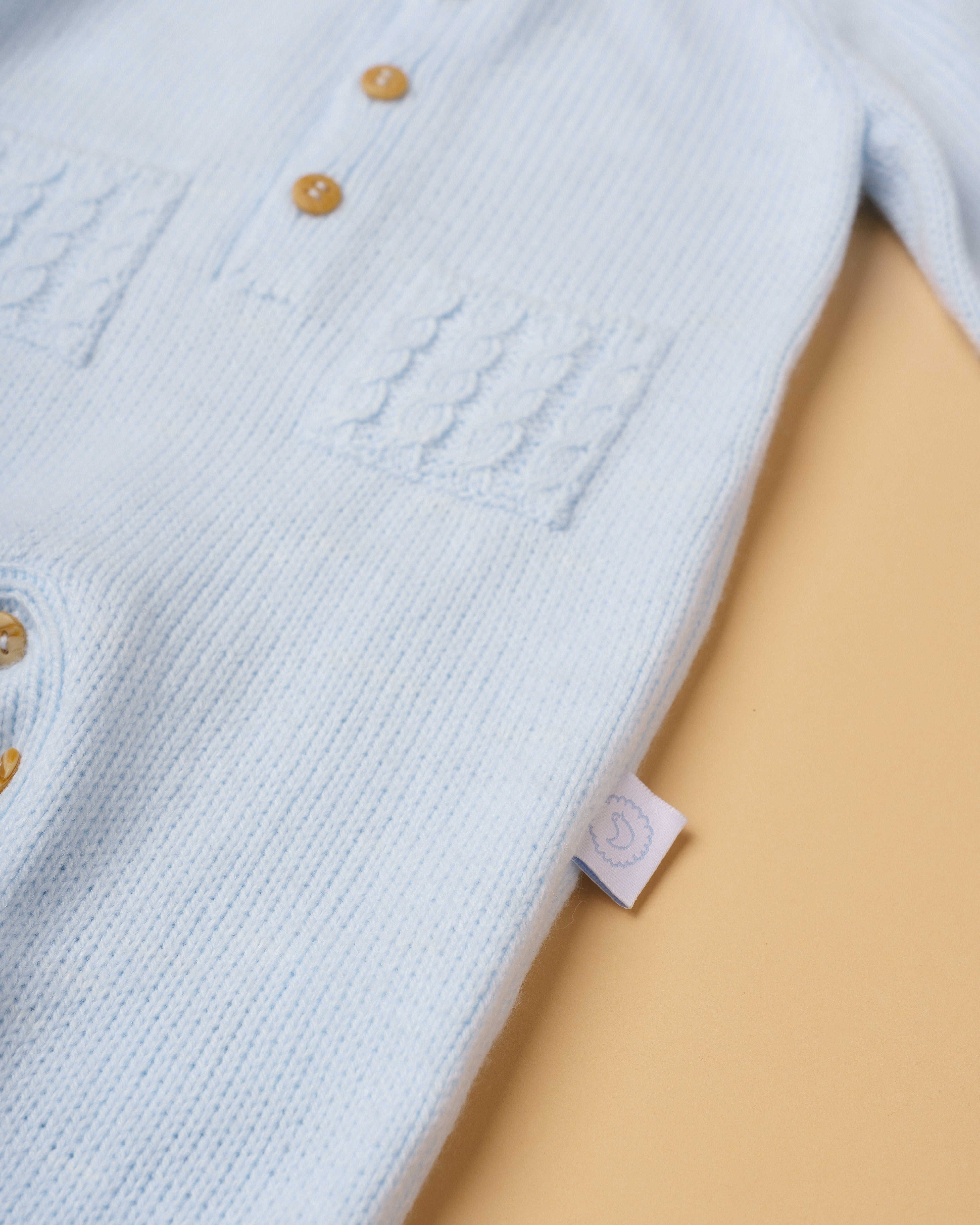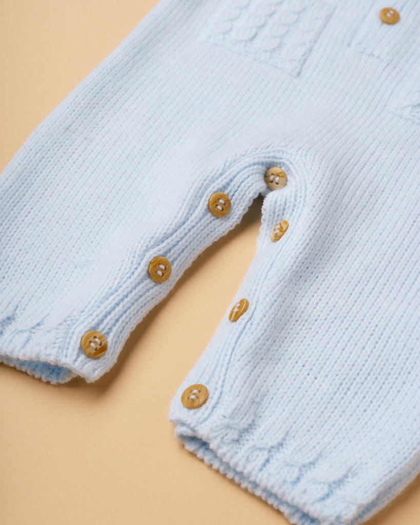 Aperta na frente e entre pernas com botões de madeira para permitir vestir e mudar o bebé com facilidade. Pode combinar com o gorrinho/ touquinha e botinhas do mesmo tema e assim fazer um look muito doce e especial.