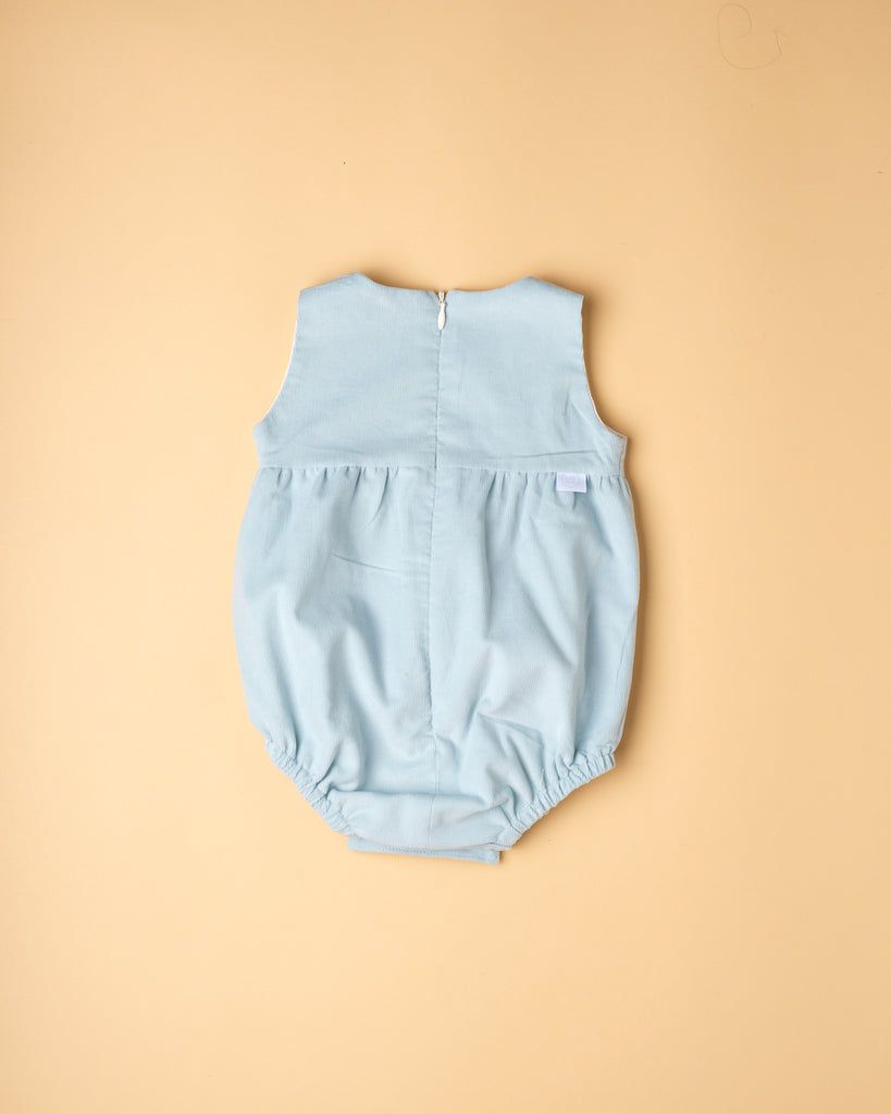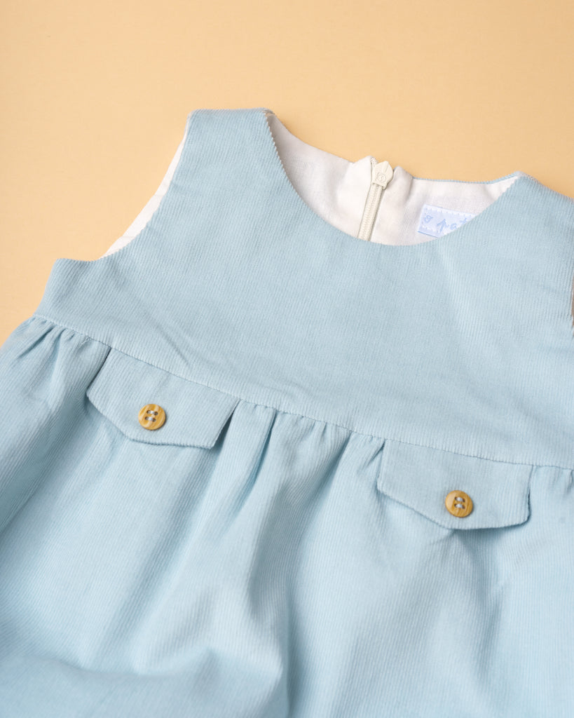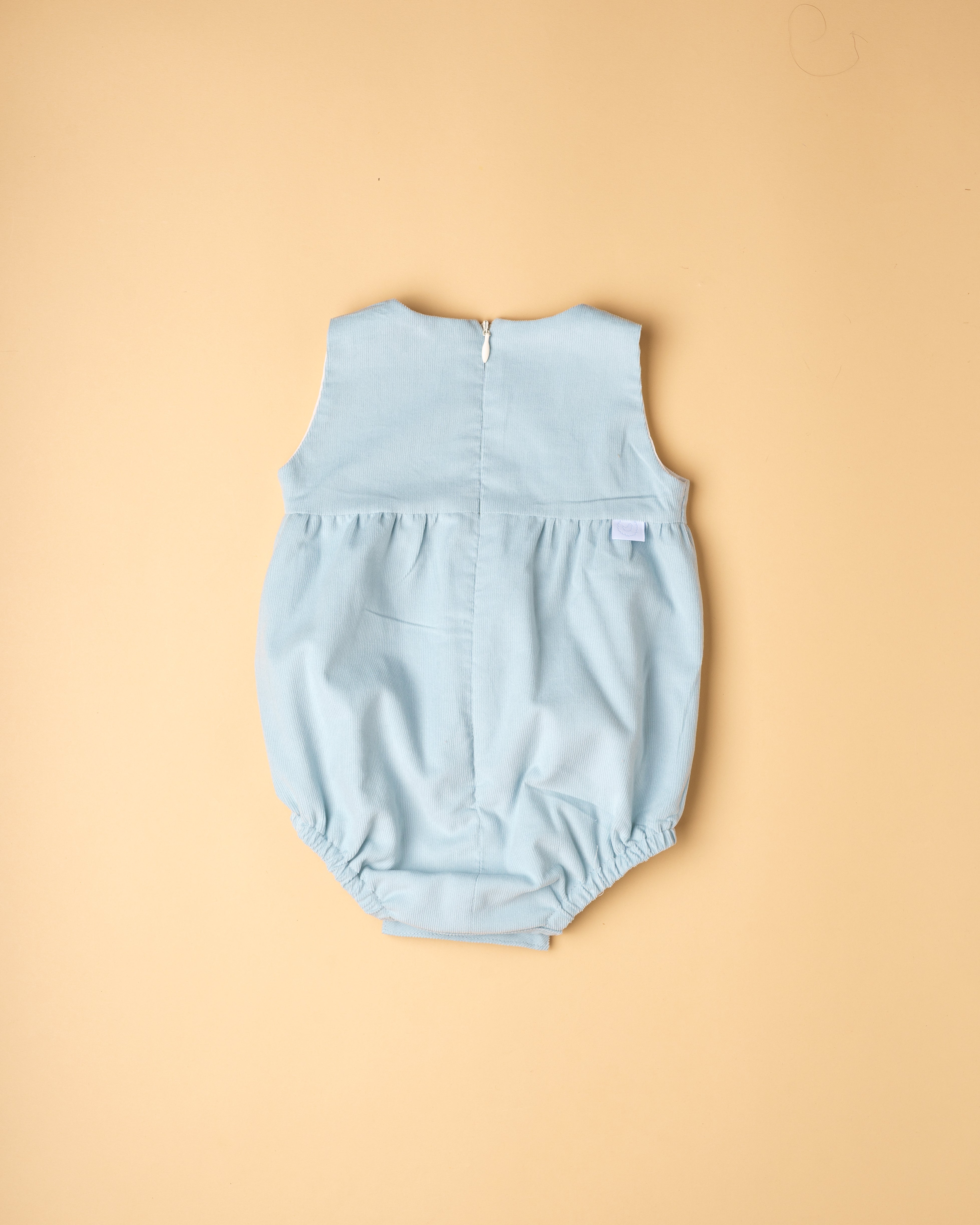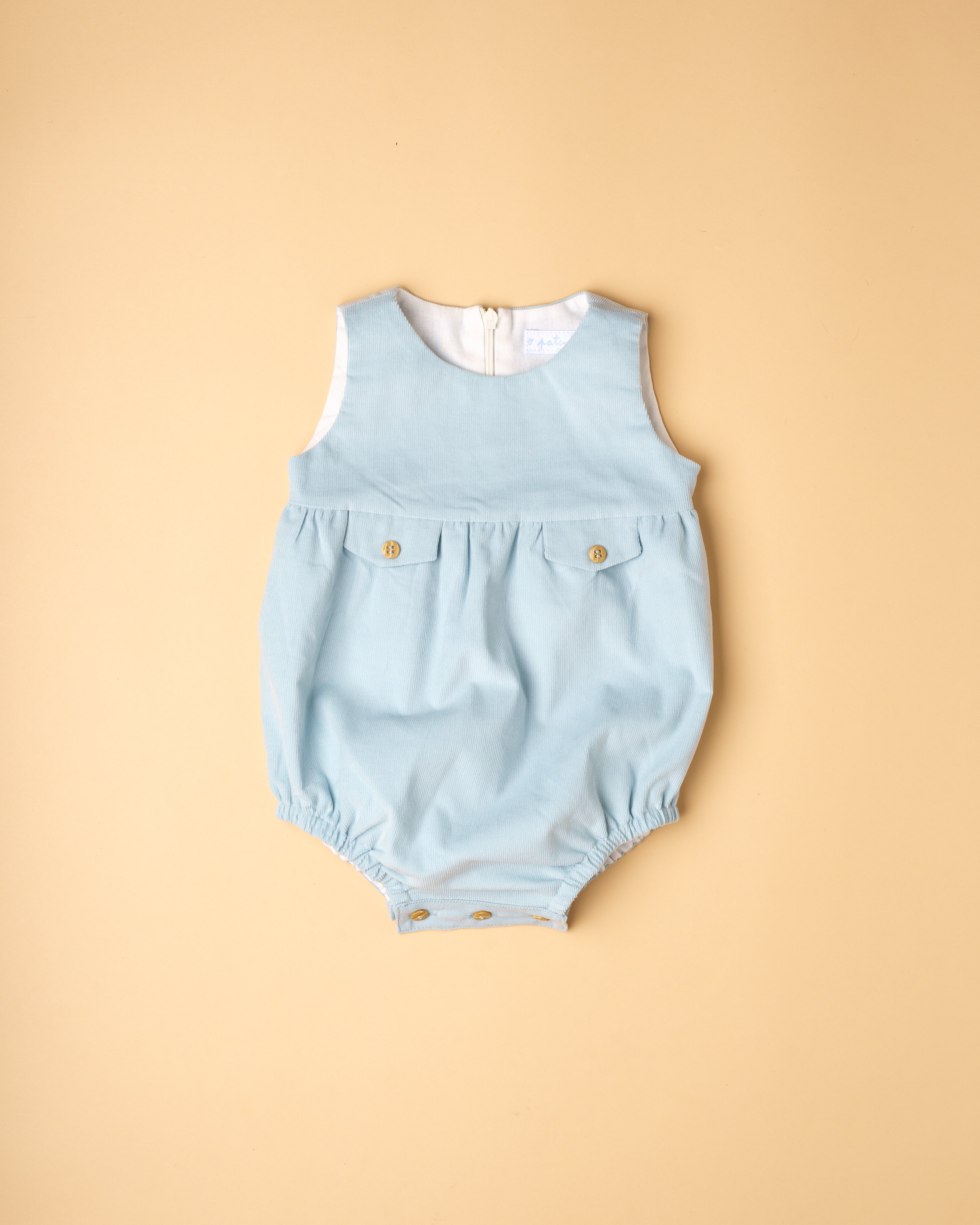 Fofo em veludo cotelé azul inglês . Tem abertura nas costas com fecho invisível e entre pernas com botões para permitir vestir e mudar o bebé com facilidade. É forrado em algodão orgânico. Perfeito para usar neste Outono com os nossos bodies ou blusinhas de gola e aconchegar com os casacos em tricot.