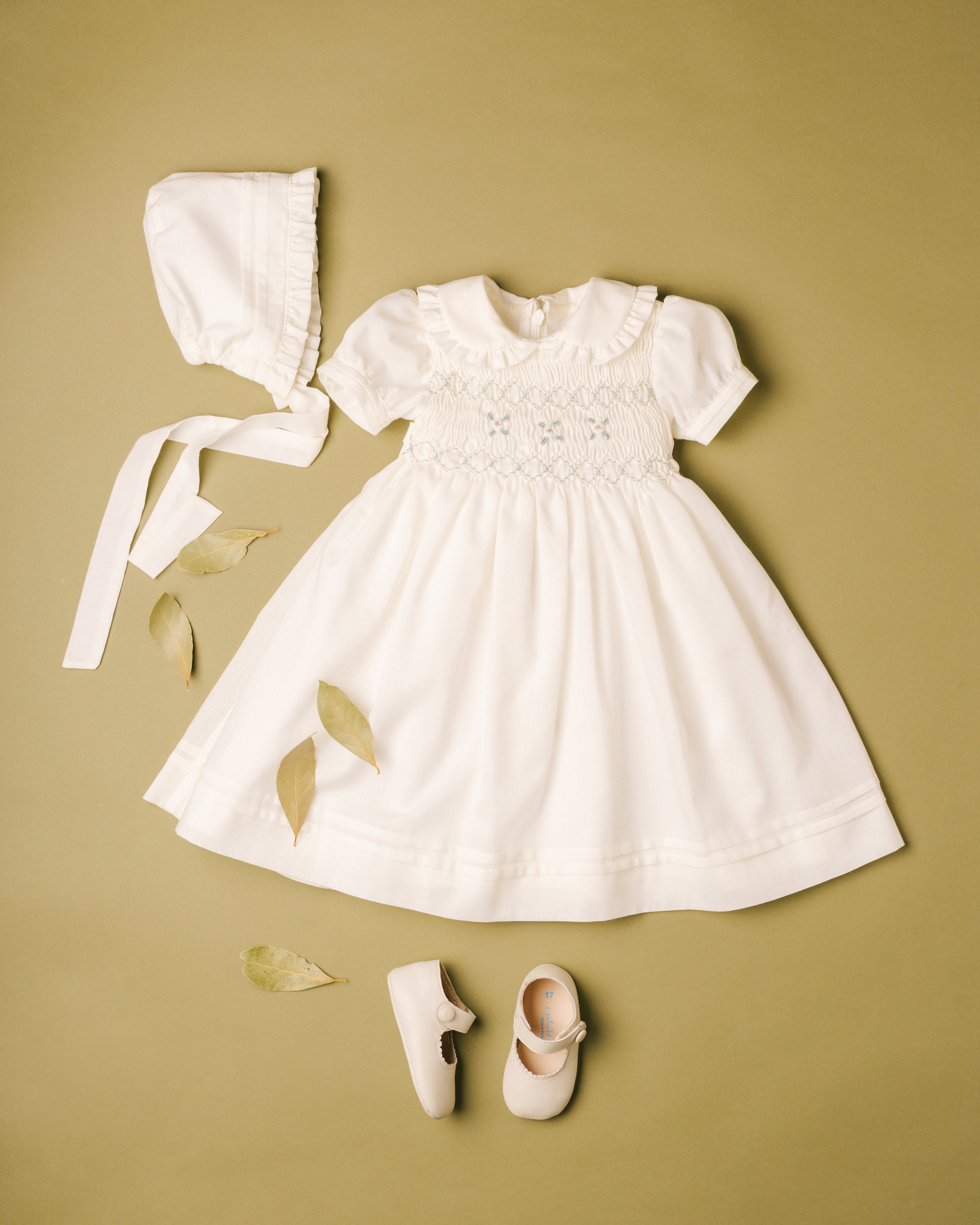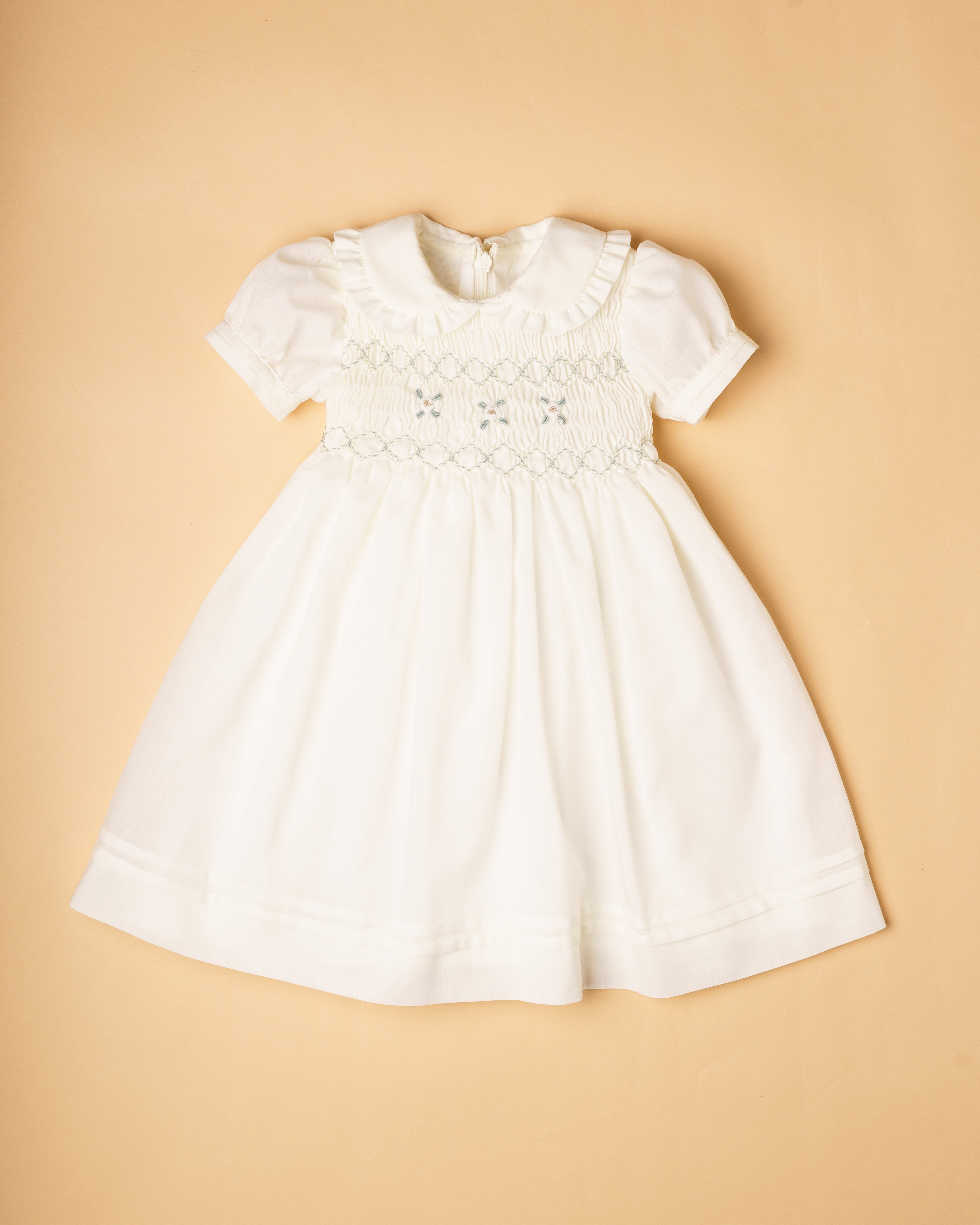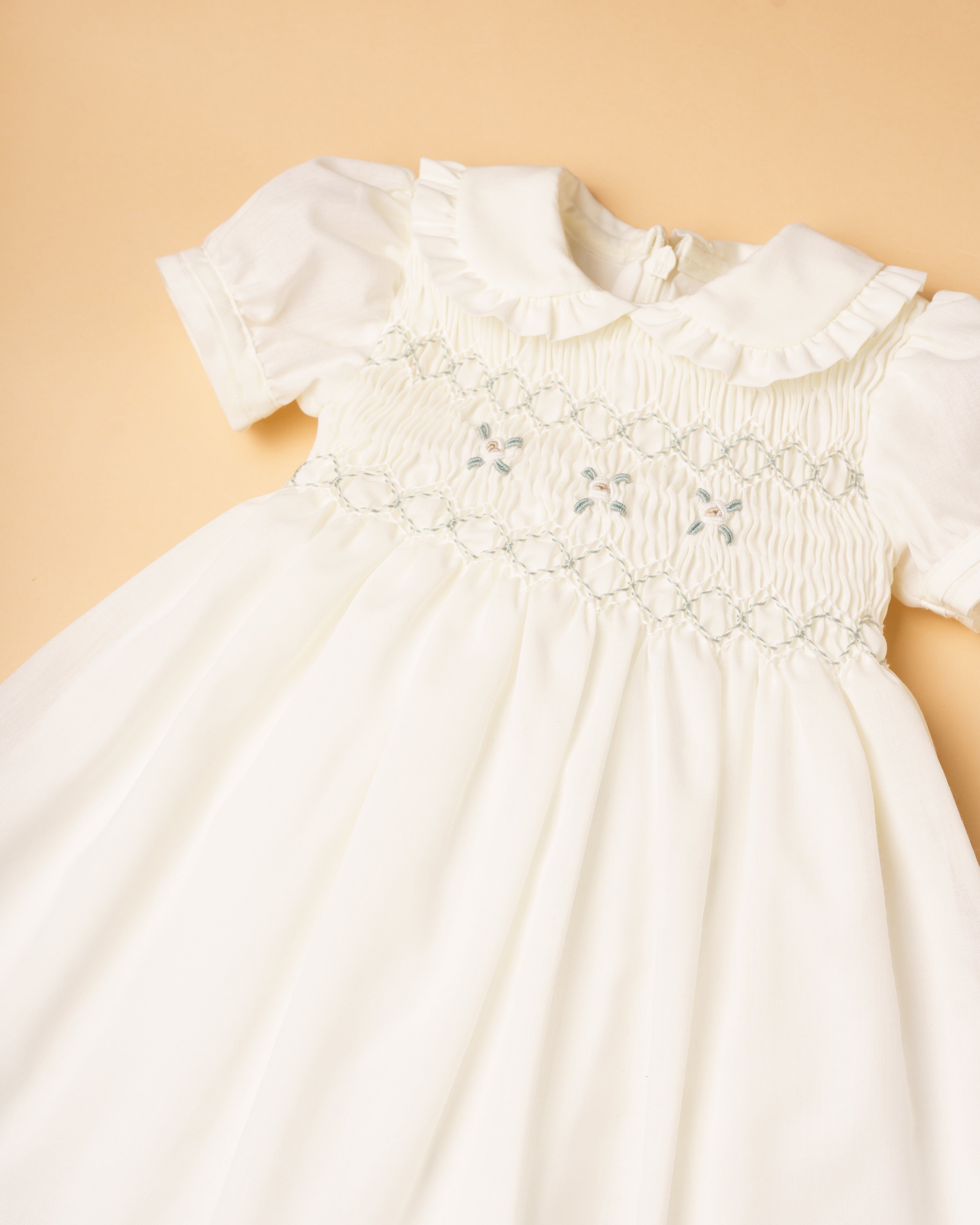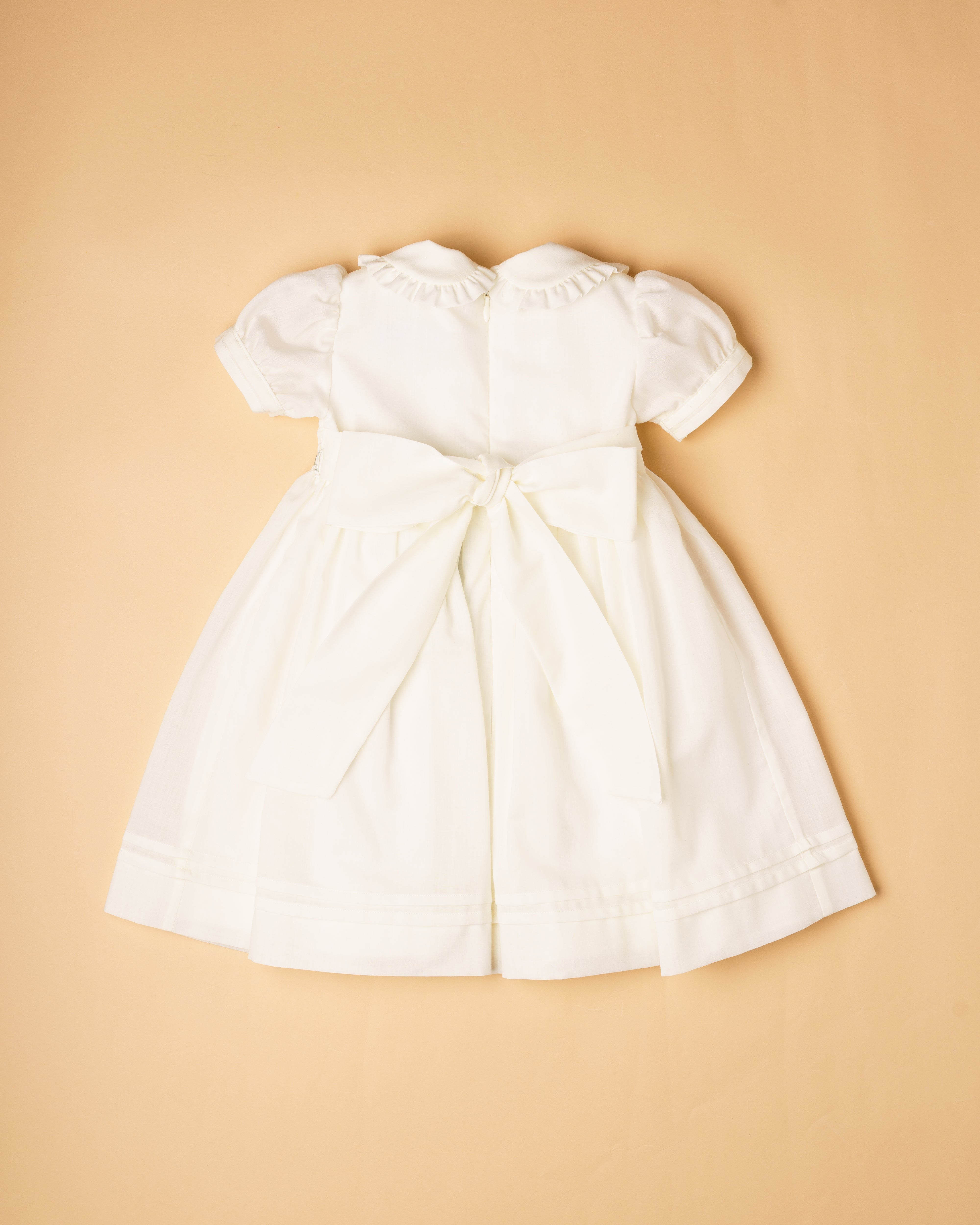 Vestido em musselina de algodão na cor cru com bordado manual no peito, gola redonda e manga balão.. É forrado em algodão orgânico, aperta nas costas com fecho invisível e ajusta com cinto e laçarote (o qual podemos executar noutras cores). Complementa-se com a touca do mesmo tema. Personalizamos com os mesmos detalhes e bordado manual a toalha e a vela. Perfeito para um batizado ou "dia especial".