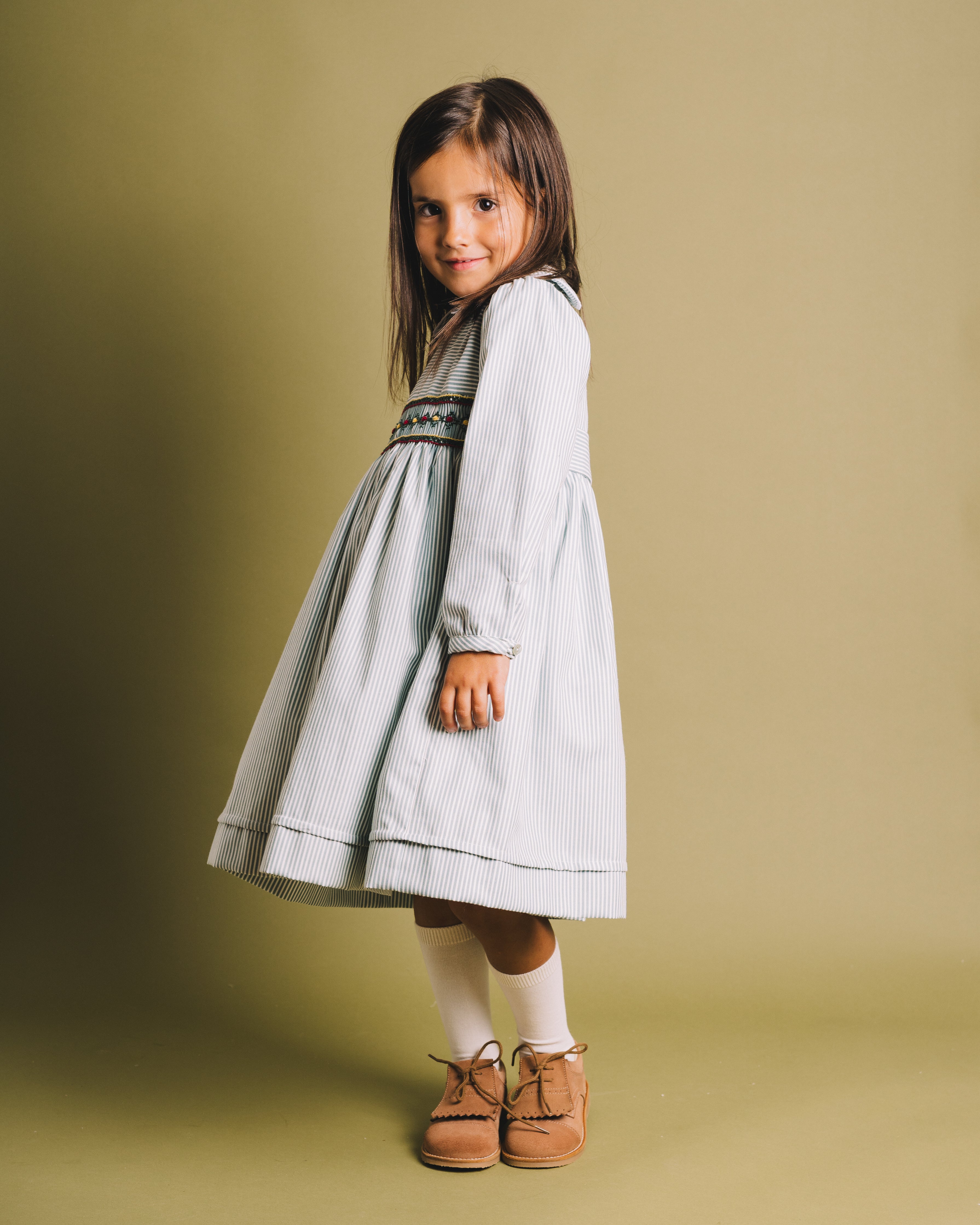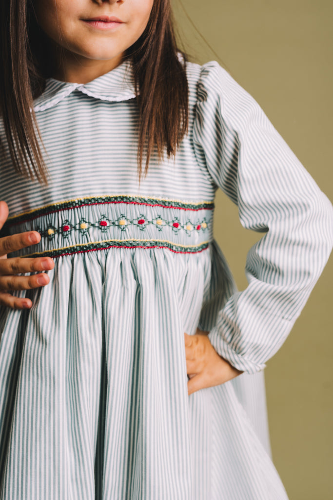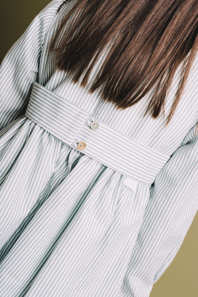 Vestido em vaiela de algodão de risca verde com bordado manual no peito, gola redonda com aplicação e manga comprida. É forrado em algodão orgânico, aperta nas costas com fecho invisível e ajusta com cinto e botão. Irresistível para esta estação.