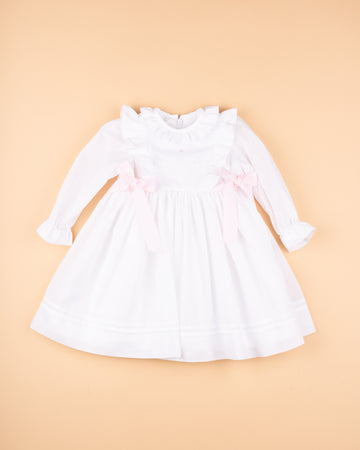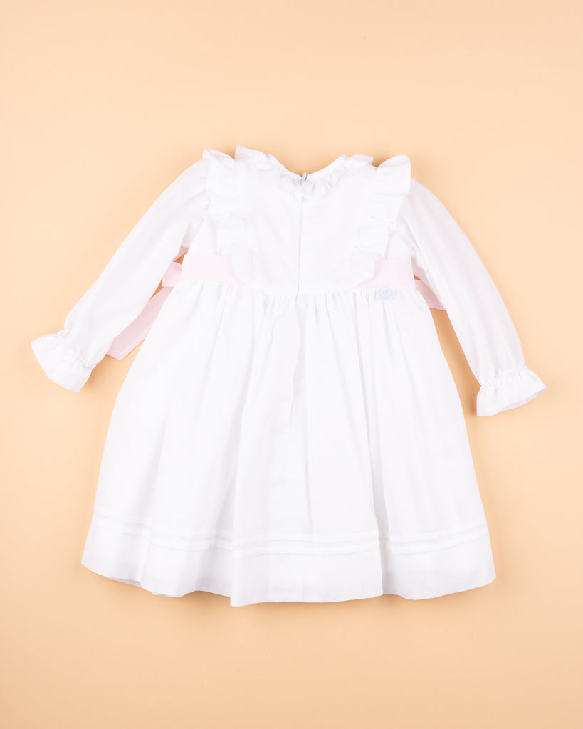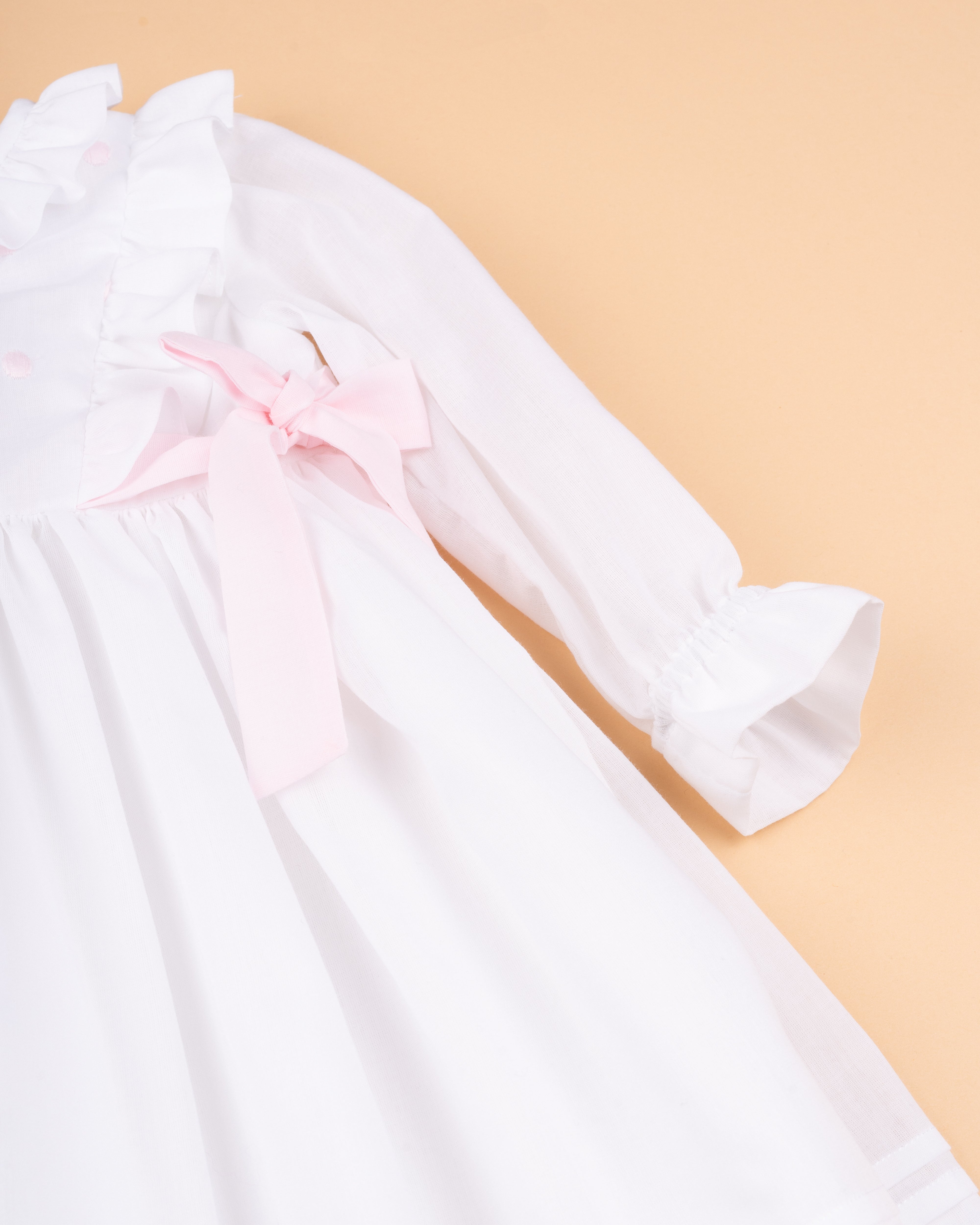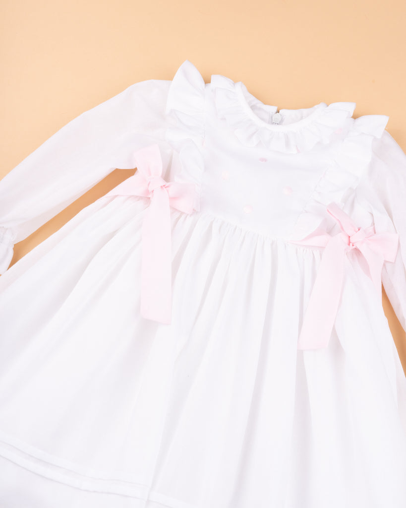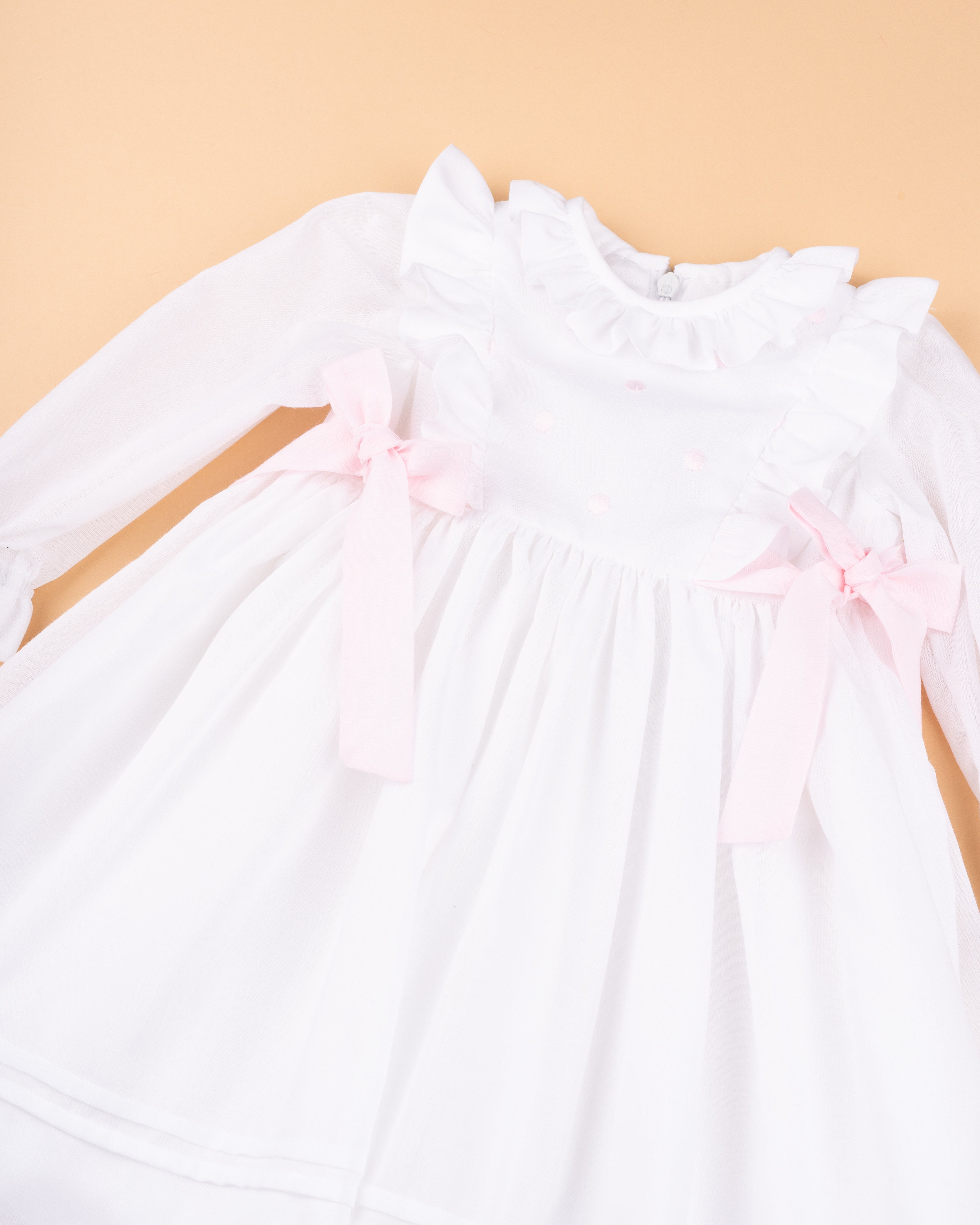 Vestido em organza de algodão branco com laços laterais em rosa claro e encaixe bordado no peito. Tem manga comprida, é forrado em algodão orgânico e aperta nas costas com fecho invisível. Muito ternurento para os dias especiais de Primavera-verão.
